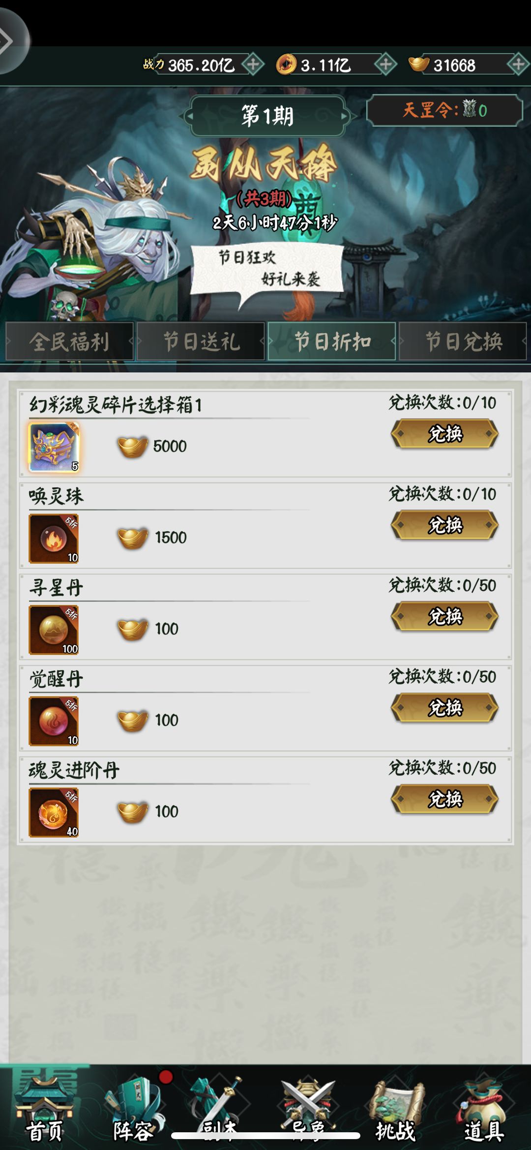 把资源全都加给最厉害的魂灵,这个建议直到退游都是适用的。等到有了更强的魂灵,就把之前培养的魂灵重生,所要付出的代价也不是特别大。关于如何判断人鬼妖尸同系列魂灵的强弱,我在之后的篇目会说明。需要注意的是,进阶丹、觉醒丹、寻星丹(简称三丹)是不能无损返还的,而是退还升到本等级的数量。因此,玩家不妨控制一下,不要有红点了就一定要去升。开局几天集中培养赠送的最高品质魂灵,之后推荐在灵宝中抽出怒攻是高额单体攻击,或至少是打横排的魂灵去毕业树妖(毕业树妖十分重要,我在之后会专门抽出一章去讲)。新手接入常驻的“节日活动”需要等待一段时间。等开启后,除了有大活动的时候实在元宝不够用的情况,都要去购买“节日折扣”中能白嫖的最高系列魂灵,并且极限培养。