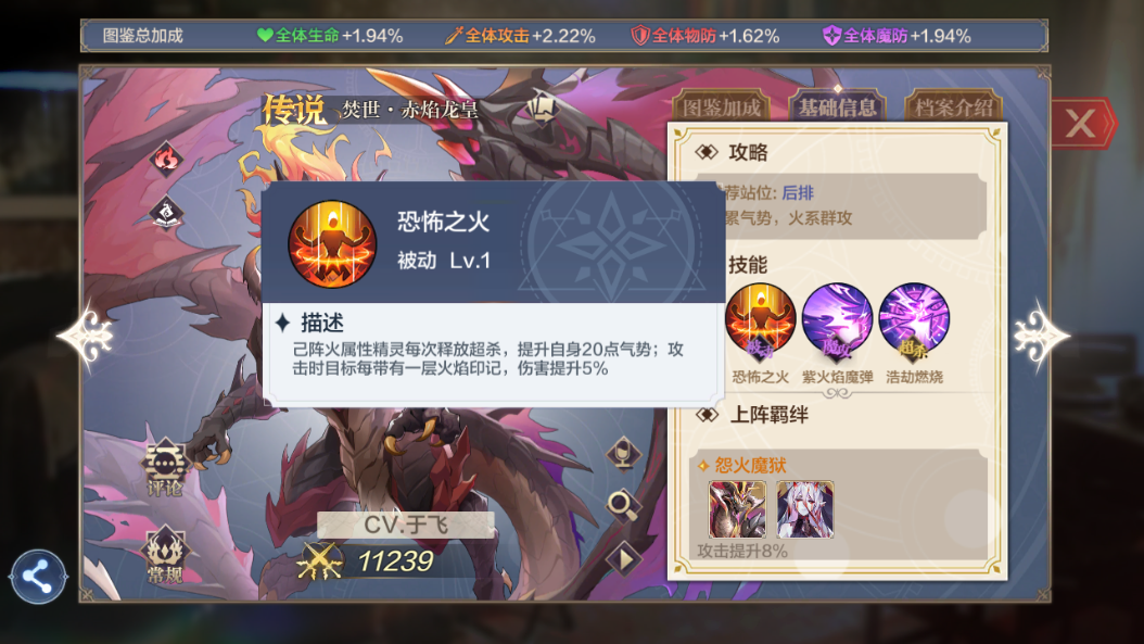 之后是龙炎的头号帮手—赤焰龙皇,火龙的最大特点就是输出高,队伍火系越多越厉害,拥有最高的攻击天赋,超杀一次打三个,还都是300%,在火系队中有着不可或缺的作用,如果你想玩龙炎队也有火龙,那务必把它带着。