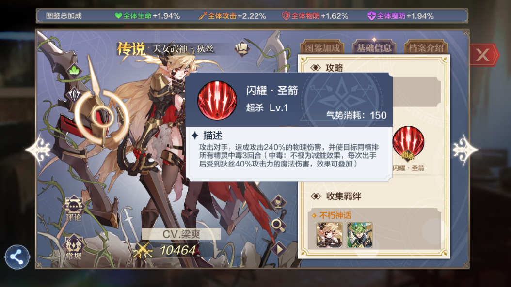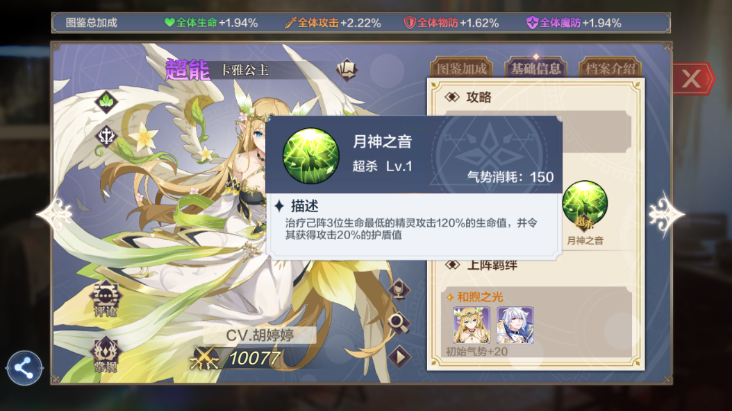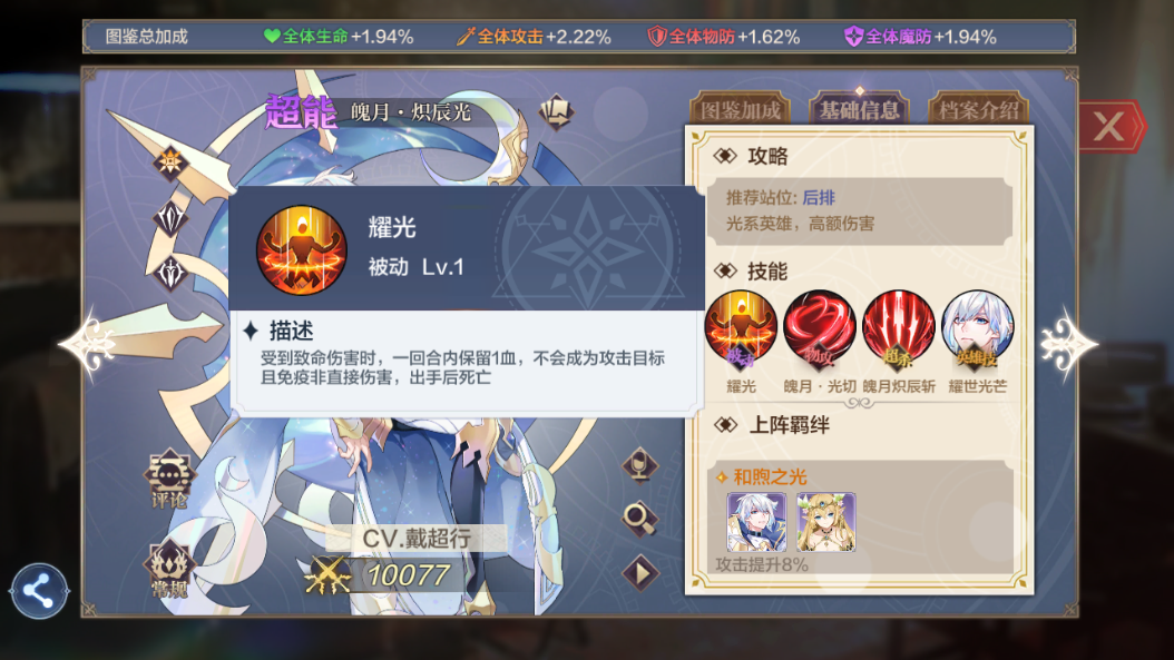 看上去可以作为光队出现的角色,英雄技是达到3只光加5%的生命,4只光再加3%伤害。这加成实在太少了,条件还十分苛刻,有空使用这么复杂的条件不如直接用圣光飞龙...