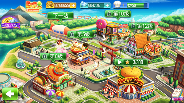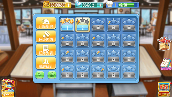 2、点击汉堡包这儿,进入之后,你需要从第一步开始,一步步的解锁相关关卡,有的关卡中还可以得到解锁要是,不过要拿到这些要是都是需要达到星星的颗数哟;