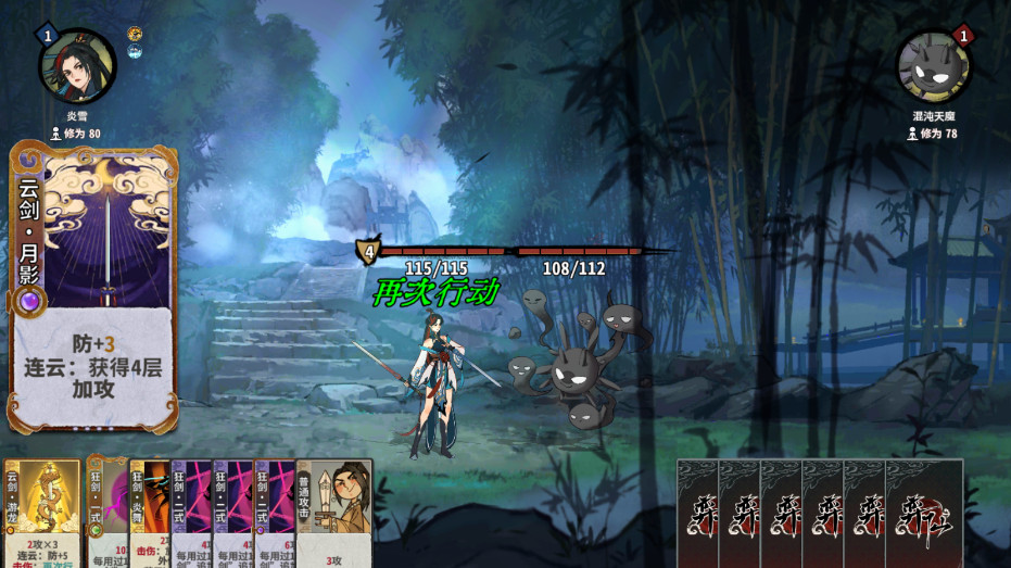 剑意:使下一张的攻击临时获得加成。(剑意的效果可以给下一张牌的每一段攻击,所以,一般是多段攻击吃剑意。比如,我有2剑意,下一张牌为2攻x3,那么可以造成12点伤害。)