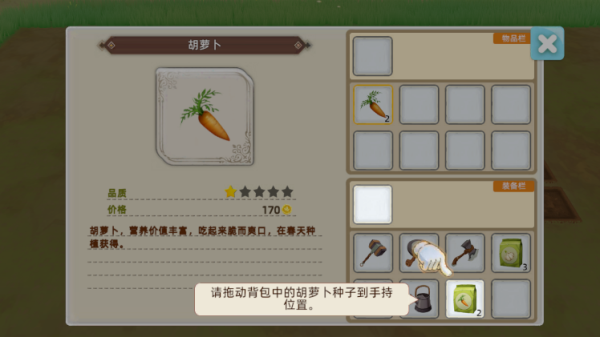 2、将背包中的种子拖动到手持位置;