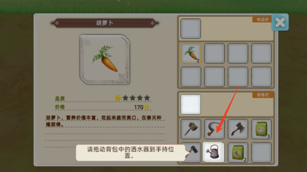 2、将浇水用到的农具拖动到手持位置;