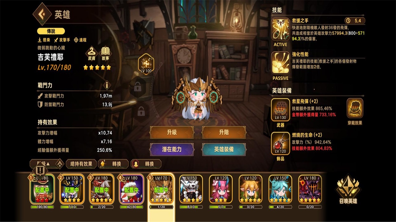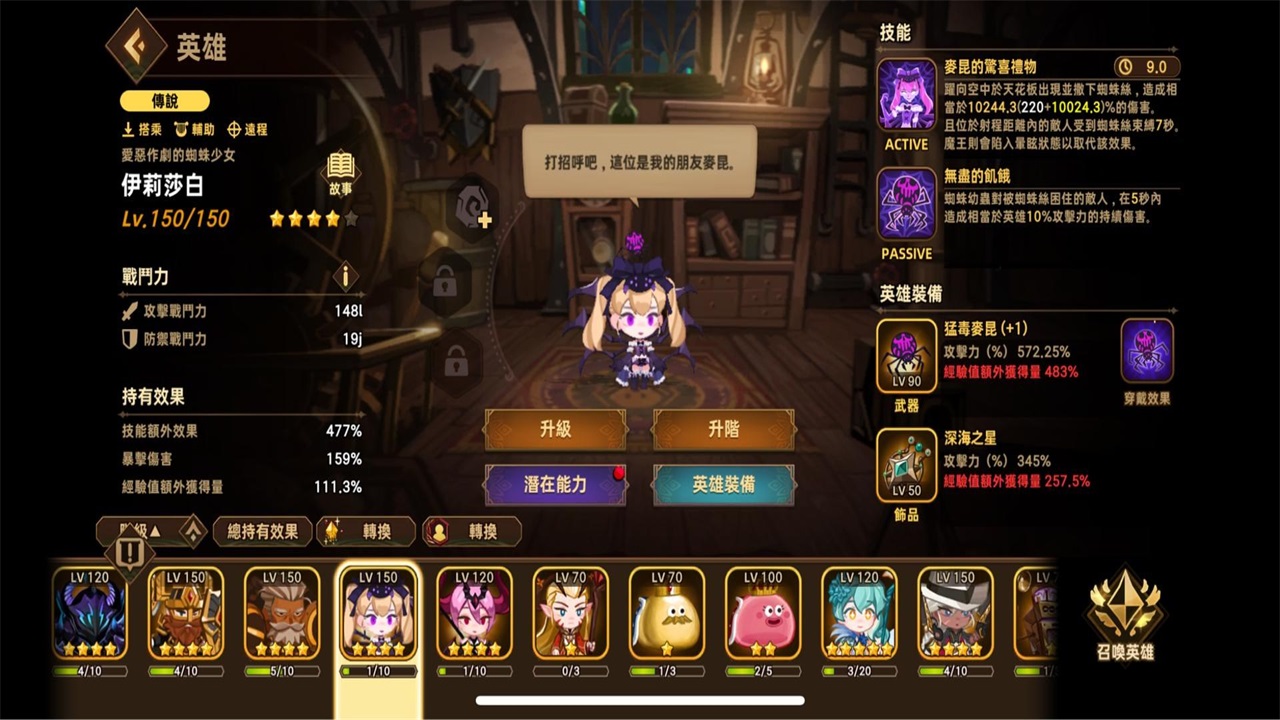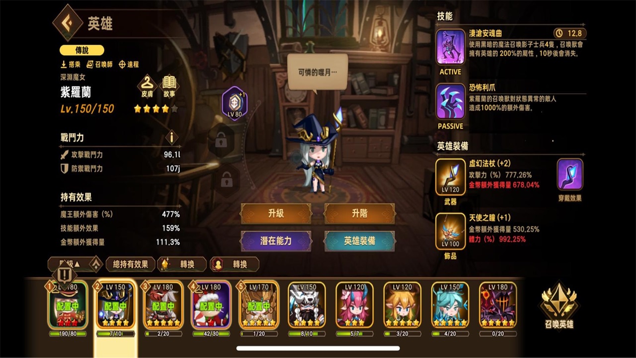 特性:召唤物推进推图,坦,单体输出王(stage20後开始乏力)、农非常实用的角色,有专武之後强度几何级上升,注意她不吃技能效果,输出向violet要专武红字攻击,但潜力依旧技能强化,要给拐加更多攻击,stage20前是最强的主输出,但20之後开始直线乏力现在用处多为配合安古拉农坦怪