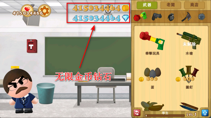 3、点击游戏右上角按钮,你还可以购买武器来攻击他;