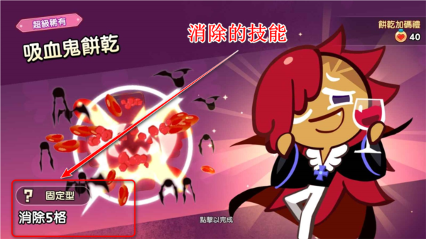 9.与搭配上场的饼干角色就会与日俱增,根据关卡的不同来搭配1只特殊的饼干上场吧! (上图为吸血鬼饼干能消除固定5格的障碍物)