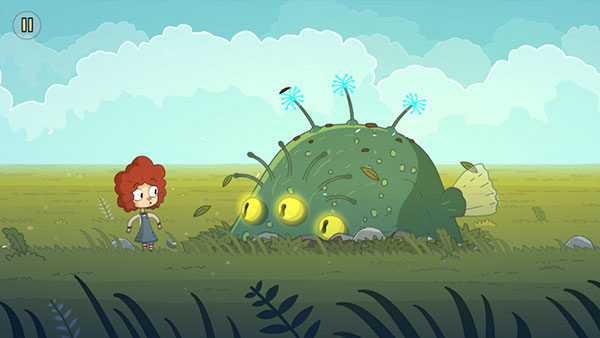 6、继续向右,三个花朵点亮出现三只眼怪兽,点击它,小女孩会抚摸它。