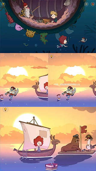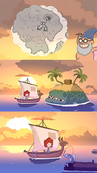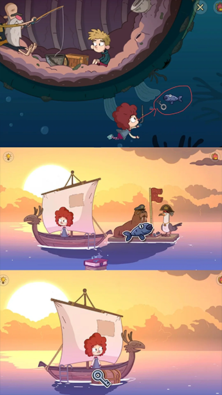 1、刚到船上就会出现小精灵(上一章也出现了)告诉你怎么回家,往前走哥哥被吞到鱼的肚子里去了,本章主要是救哥哥出来,要潜入水里需要吸管,一直往回走会看到一条鱼嘴里有,直接点击它,问它要。