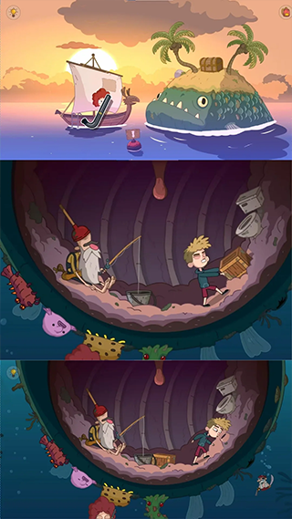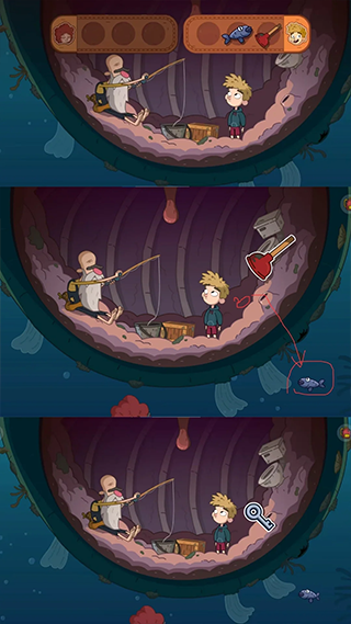 2、用习惯潜下水,会看到哥哥在鱼肚子里,还有一个老头钓鱼,这张主要是两个角色换着来交互。哥哥交互把箱子搬开,把娃娃通过鱼气管排出去给妹妹。