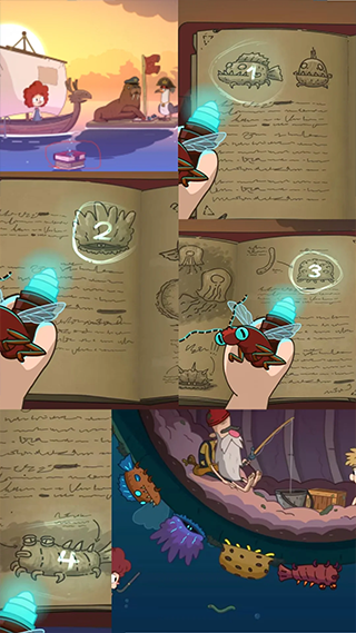 4、在中间场景,点击那本书,用萤火虫看有些画上面有数字,记住数字对应图片的样子顺序,潜入水下,把贴着鱼的动物按顺序排好。