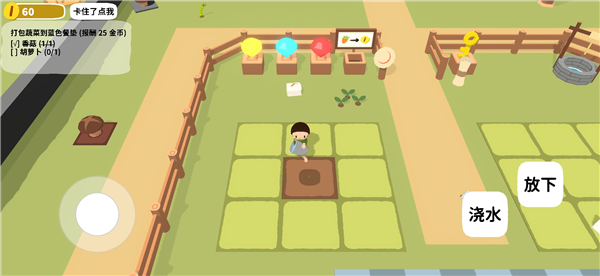 3、点击屏幕上水桶移动人物到种植的土地上会出现浇水按钮,为刚播下的种子浇水,等待作物成长。