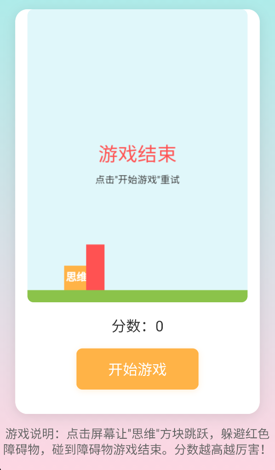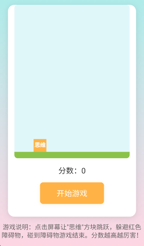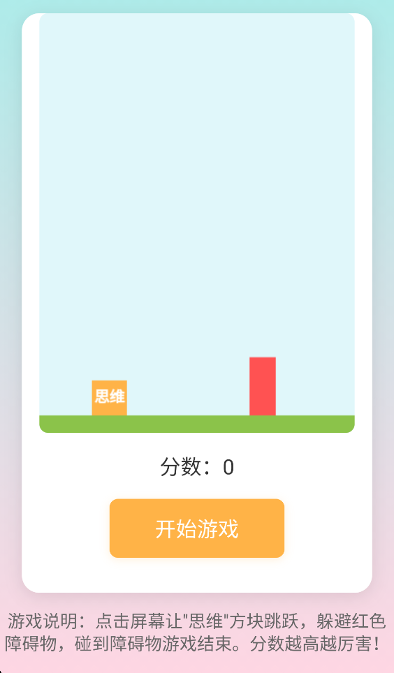 思维跳跃大冒险是一款充满刺激与挑战的反应力休闲游戏,在这款游戏中,玩家将控制思维方块,通过不断点击屏幕,让它在快速移动的环境中灵活跳跃。游戏的目标是避开道路上的红色障碍物,因为一旦碰到障碍物,游戏就会立即结束。玩家必须保持高度集中,通过快速的反应来避免各种突如其来的障碍。