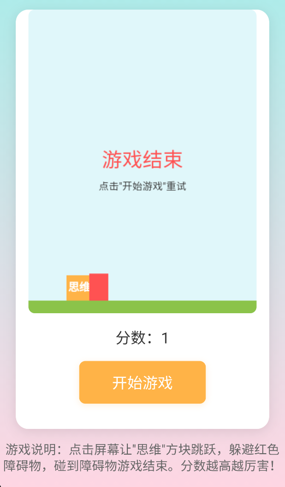 2.点击屏幕让你的思维方块跳跃起来,躲避红色的障碍物。