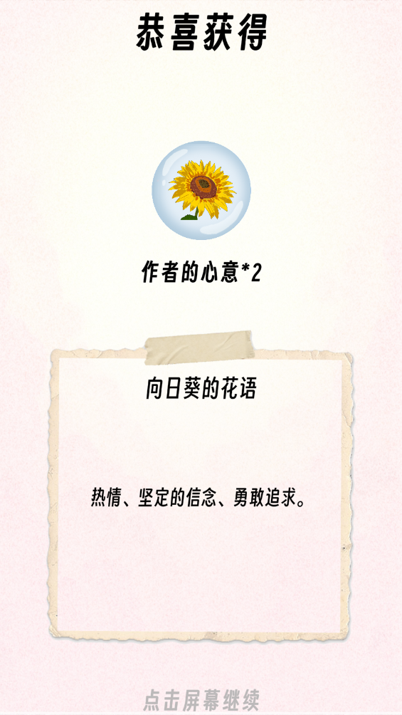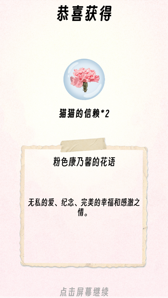 5.在一次随机事件的结束后,你将收获一朵美丽的粉色康乃馨,作为你旅程中的小小奖励。
