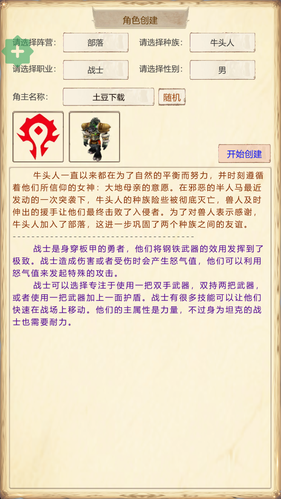 2.为你的角色选择他的职业、性别、种族(前期只有这几个可以选择),取一个名字,就可以创建角色了。