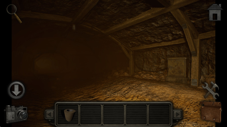 7、回到储藏室用铁链将钩子和地下室门把手进行连接,然后用锁固定铁链,再转动轮盘升起地下室的门。接着进入地下室拿走箱子上的「摇杆」,再记住钟表上的时间提示。