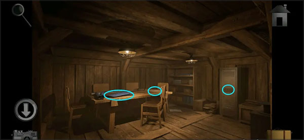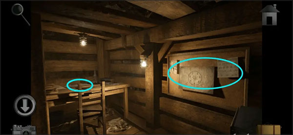 4、往里走进入办公室,观察桌子上的蓝图,然后根据上面的提示打开木屋下面上锁的盒子,完成后拿走盒子里的「钥匙」和「挂锁」。