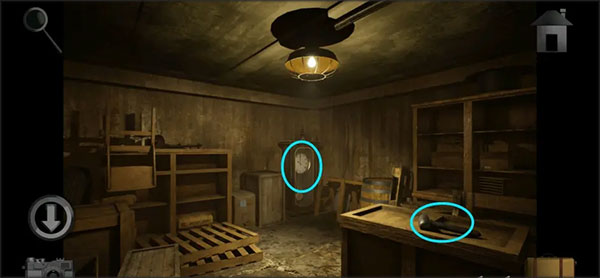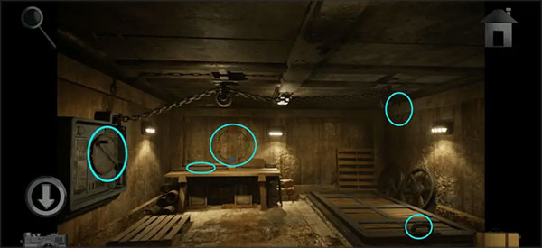 5、用钥匙打开区域左边的储藏室,进入后观察墙上的提示并拿走桌子上的「断线钳」。接着点击左边的机关,转动轮盘降下锁链。