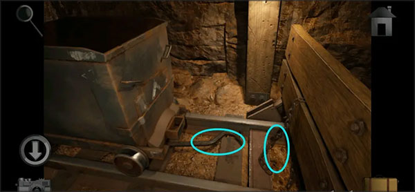 6、退回到第一路口进入右边的隧道,先观察路边车轮上的提示,接着往里走用断线钳剪断并拿走矿车上的「铁链」,再拿走矿车下面的「撬棍」。
