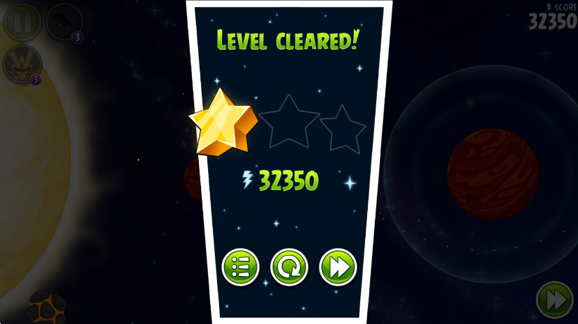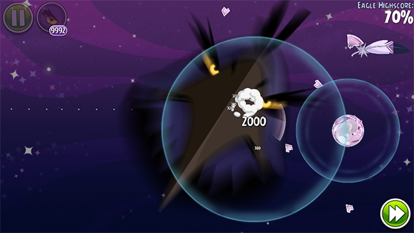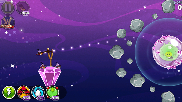 太空穿梭鸟(原黄色的三角形鸟)拥有非同凡响的天赋,当它被发射到中途的时候,轻轻点击一下屏幕,它就会进行直线式的冲刺攻击!犹如导弹一般,以恐怖的速度冲向绿猪,威力极大!不过,加速的时机很难掌握,否则很可能会飞出打击目标,无法制造精确打击。但一旦掌握好使用方法,愤怒的小鸟就会真正地愤怒起来,给木质结构的猪堡制造极大的破坏。