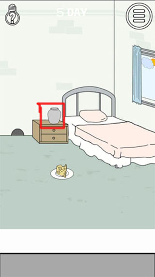 7、到右侧拿到石头和钥匙,再到左侧把石头压在桶上。用钥匙将柜子打开,把被子移开