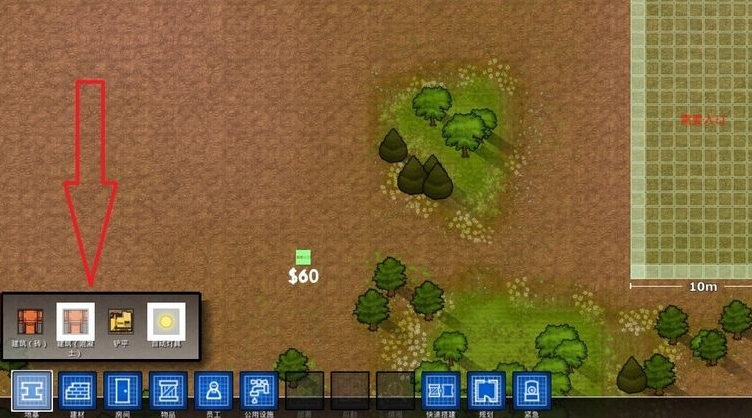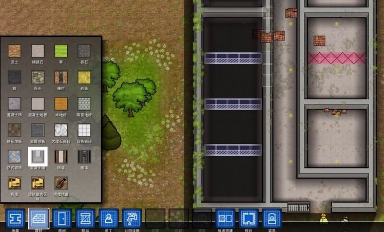 1、首先在左下角【地基】里使用混凝土建造地基,牢房最好是两边做牢房中间留两格做走廊。