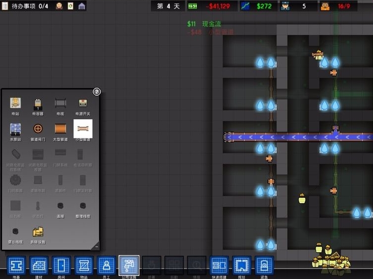 4、等工人建造完毕就在【公用设施】里放上发动机、水泵,再铺设电线和水管
