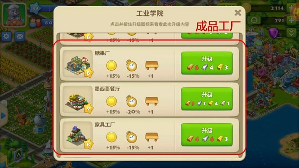 对于成品工厂的升级顺序,应根据金属锭的数量,优先升级物品生产时间较长的工厂,如:糖果厂、造纸厂、果酱厂、家具工厂、墨西哥餐厅等;