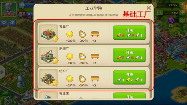 基础工厂生产的物品除了可以作为成品销售外,还可以作为成品工厂的生产原料,因此想要提高小镇工厂的整体生产速度,就必须提高基础工厂的等级,越高越好。