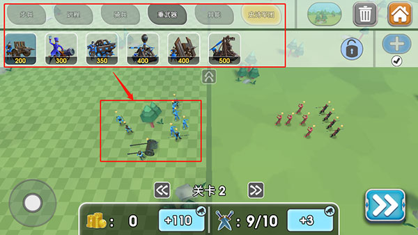 3、在这里我们可以选择步兵、远程、骑兵、重武器、异能等多种分类,点击要上场的兵种,选择好之后再点击一下放置的格子就可以上场了,如果想要换下场上的棋子,只需要再点击一下就好了;