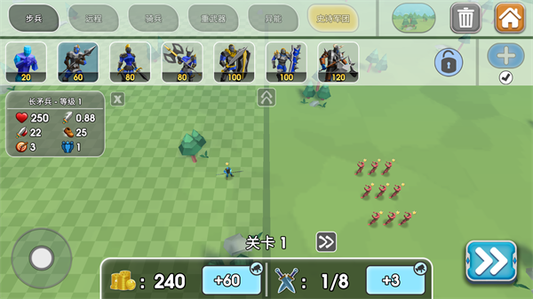 (1)长矛兵性价比高,遇到敌方远程多时,前面放一排盾,后面多放长枪,稳。