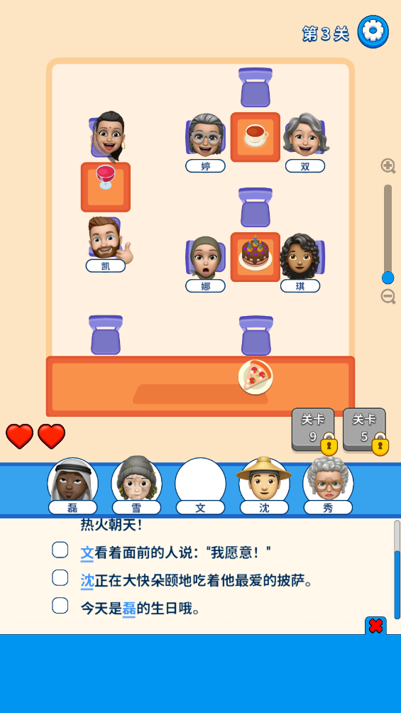 那是我的座位是一款极具创意和挑战性的逻辑解谜游戏,座位的安排不再是简单的选择,而是考验你智慧和推理能力的场所。你将成为一名座位安排大师,需要在每个关卡中根据不同角色的需求和偏好,巧妙地安排座位,解决一系列复杂的冲突和难题。无论是在课堂上、餐厅里,还是公共交通工具中,你都需要快速而精准地思考,运用你的策略和逻辑,成为座位规划的真正高手。