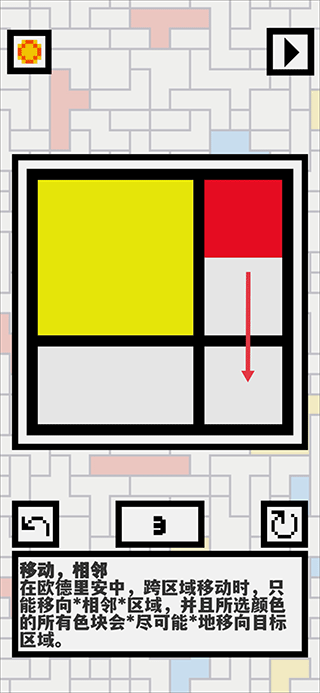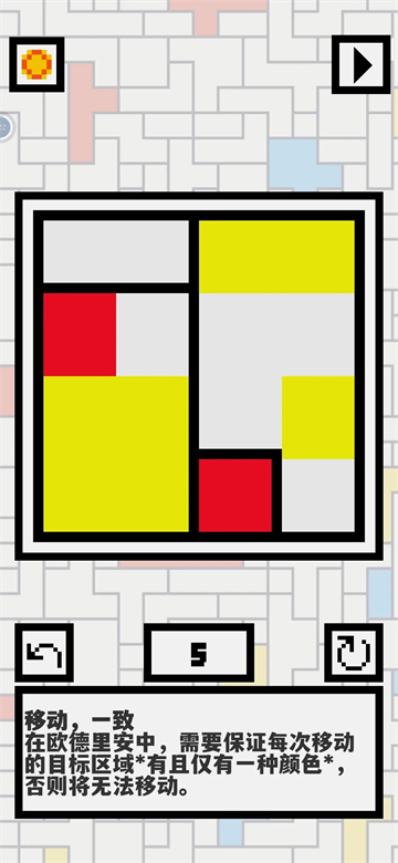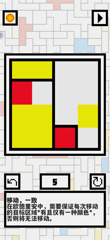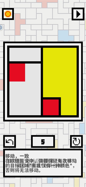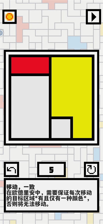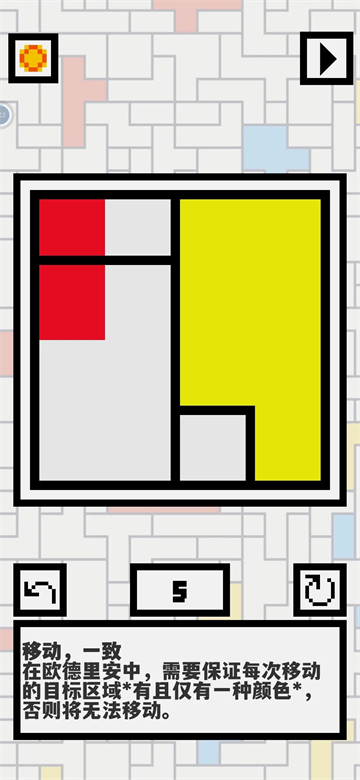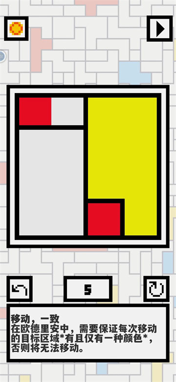 欧德里安是一款充满几何美感与抽象艺术气息的益智解谜游戏,玩家将探索由色块与黑线构成的迷人世界,挑战自我在规则与美学之间找到平衡。你将通过移动色块,将它们准确地放置到画布上的特定位置,进而恢复每一幅画作的和谐美感。每一次的正确组合都像是在完成一幅独特的艺术作品,给予玩家极大的成就感。