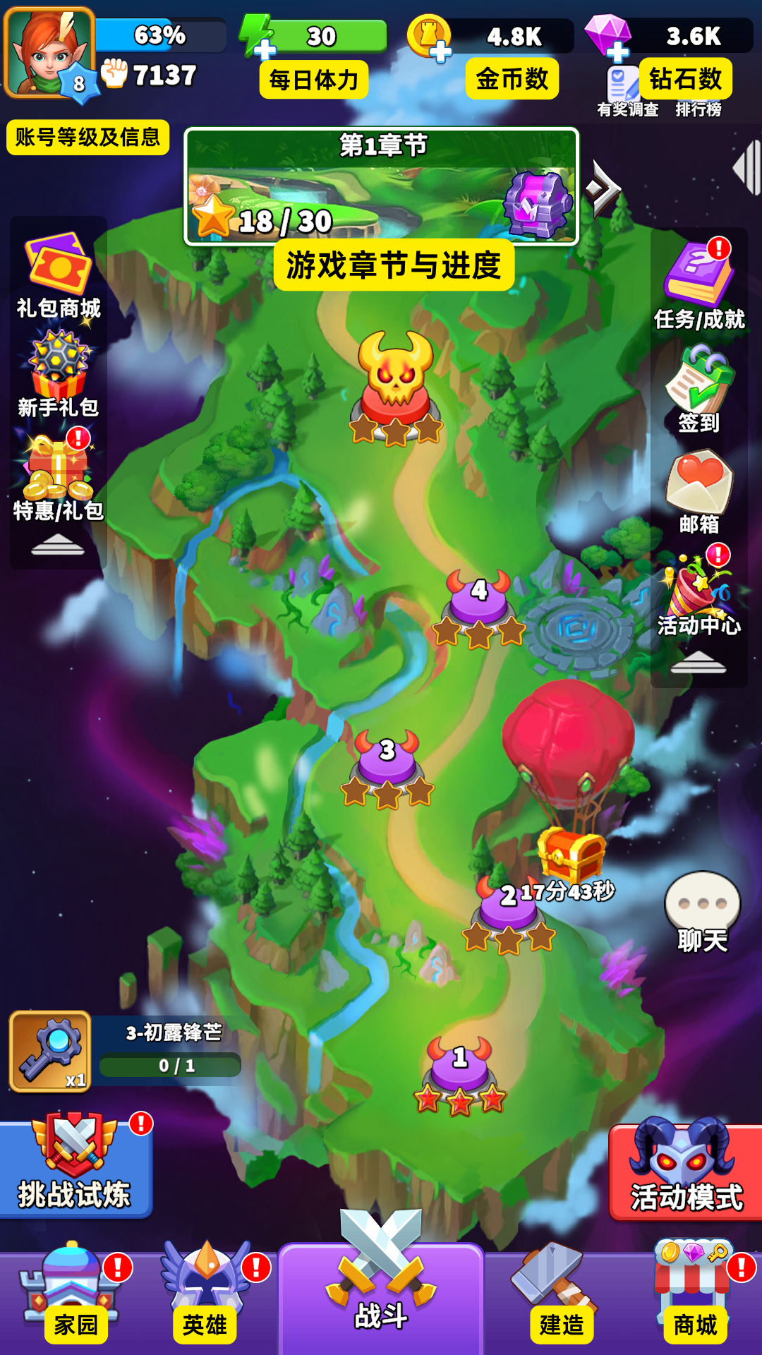 家园:升级家园内的建筑物获取局外养成的玩法系统,能够生产资源升级家园从而解锁丰富的道具奖励,以此更好的挑战后续关卡。游戏内有离线收益机制,回归即可收获家园内的资源回报。