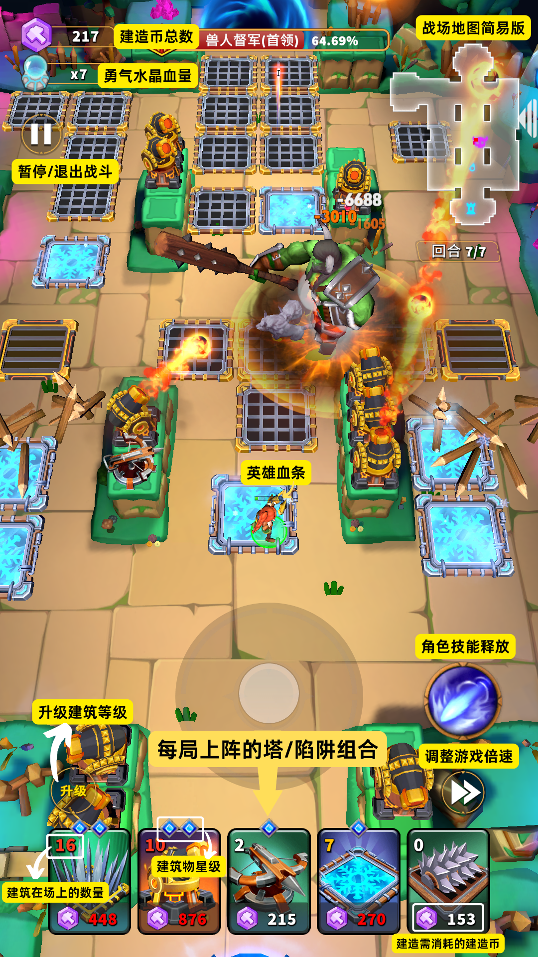 教程:为了帮助大家快速上手游戏,游戏在内设置了简单的教程关,教会大家英雄的基本操作和放置地面陷阱和高台塔,介绍游戏内的一些挑战模式/福利活动/家园玩法等等。