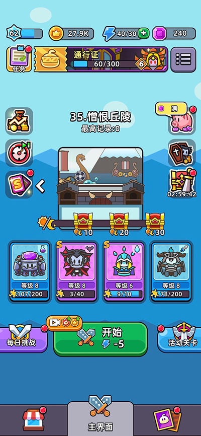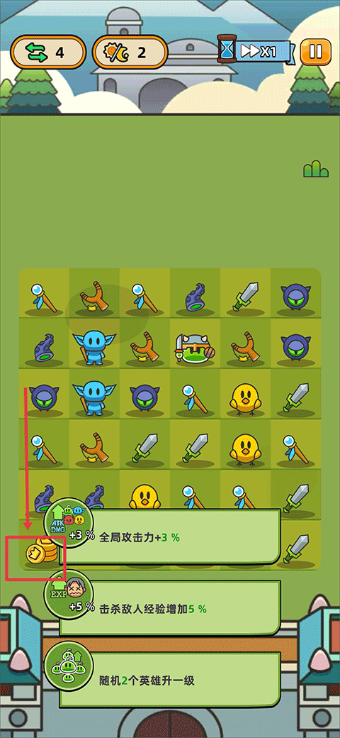 5、我方英雄在成功抵挡出现的敌人后会获得分数,当上方进度条满时同样可以解锁技能选择功能;
