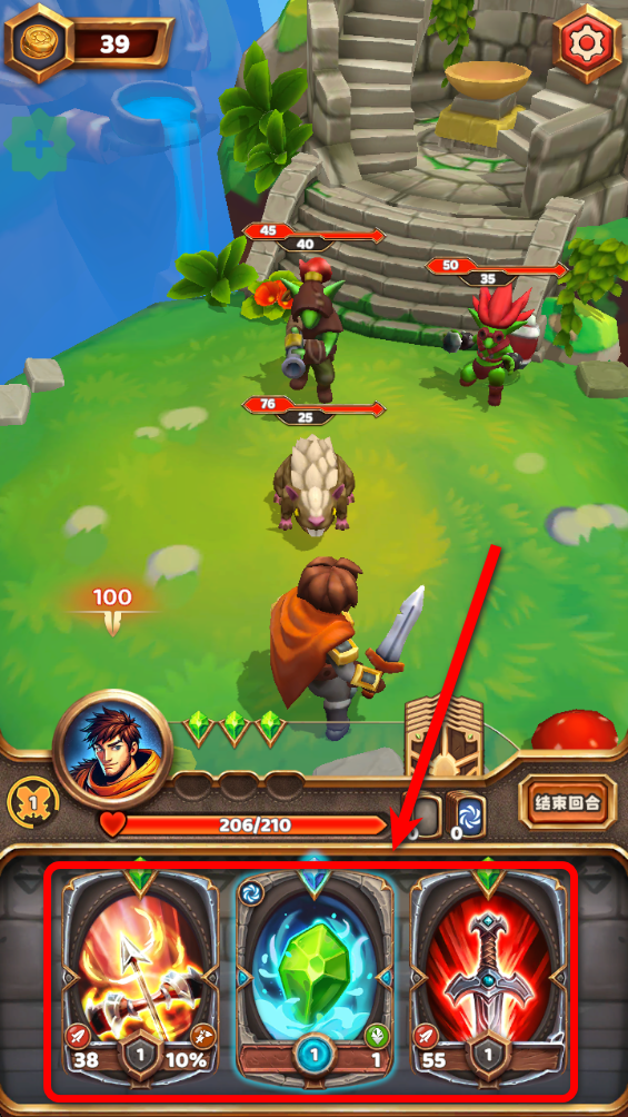 4.这个绿色的石头就是你的回合数,一块石头代表一次攻击机会,卡牌上有绿石头标志的就是需要耗费绿色石头的。