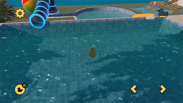 2、水面上的其他鸭子可以轻轻碰触互动,触发短暂的动作或音效,滑梯、漂浮圈等物件可推动鸭子做出跳跃、滑行等动作,增添趣味。