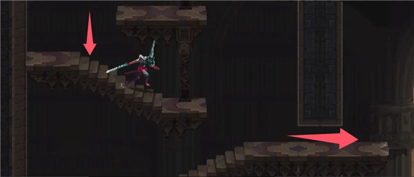 下来后跳到右边的平台上,沿着这一层平台一路向右。