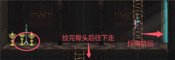 在一堆圣杯当中捡到妓女琼恩的髋骨。髋骨这层右边的门是去忏悔祭坛。如果需要捡尸就去一下。之后沿着梯子往下走。