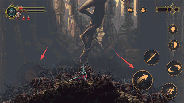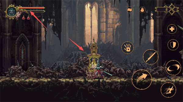 上方显示的是角色的血条,当血量耗尽时,可以在神像前回血,或者点击右侧的【+号】使用药水进行恢复。