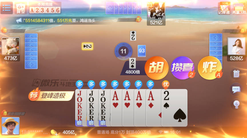 每局游戏使用两副扑克牌并加入两副大小王,共计104张普通牌与6张王牌,每名玩家开局获得7张手牌。