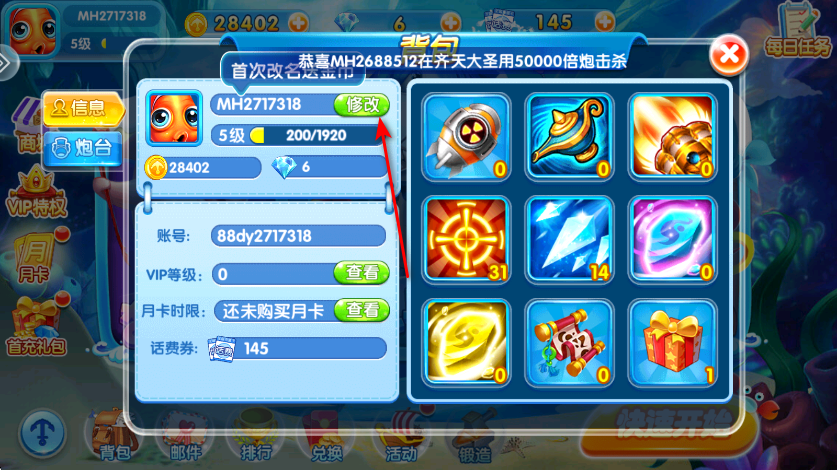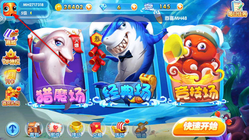 1、进入游戏点击快速开始即可立即进入渔场进行捕鱼