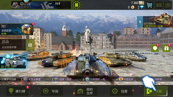 1、游戏界面:进入游戏后,玩家可以看到军团、排行榜、设置、我的仓库和开始等选项。