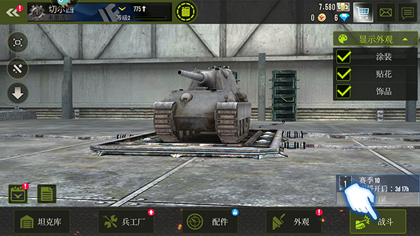 4、点击开始,进入游戏备战室,这里有坦克库(选择你要上场的所拥有的坦克),兵工厂(可以升级装甲、炮管、引擎等),涂装(坦克花纹,可以增加攻击力和开火速度)以及贴花(标志,可以增加攻击力和速度),其中涂装和花纹用钻石买,而且有时间使用限制,大概两天就消失。