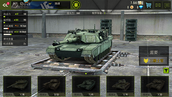 3、坦克库可以提前预览你目前不可以得到的坦克。好的坦克要用钻买,要用人民币,其它的可以用军费买,军费在战斗中捡拾即可。买坦克还要等级,等到一定等级才可以买好的坦克,等级高了才可以开新图。