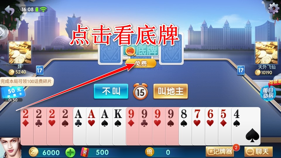 8.进入新手局环节,我们可以点击看底牌。