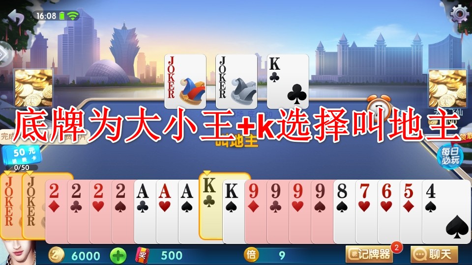 9.看到底牌为为大小王+k选择叫地主。