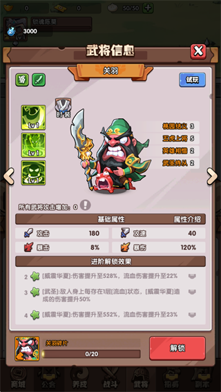 关羽:释放[威震华夏]技能时有20%几率返还100%的技能冷却