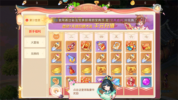 4、在游戏主菜单中点击资源阁,再点击这里立即领取无限银币;